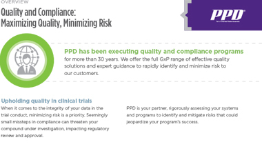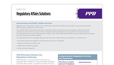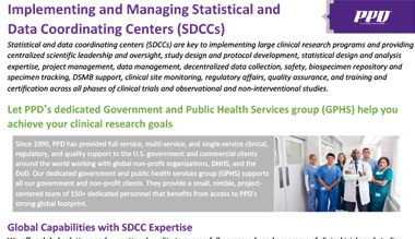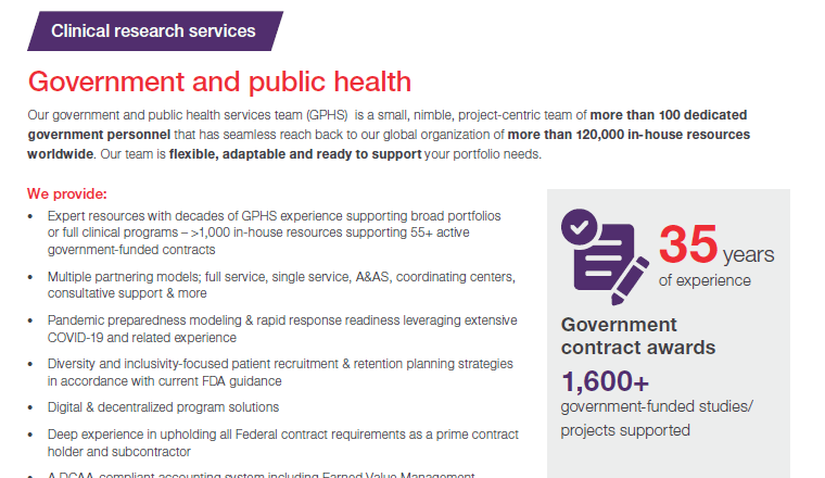 For 35 years, the PPD™ clinical research business of Thermo Fisher Scientific’s dedicated government and public health services group has successfully delivered services to various agencies, contractors and non-profits in both prime contractor and subcontractor capacities within full compliance of all federal contracting requirements.