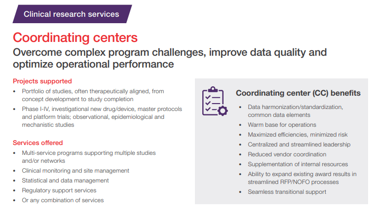 - Coordinating center support for multi-service / multi-protocol programs