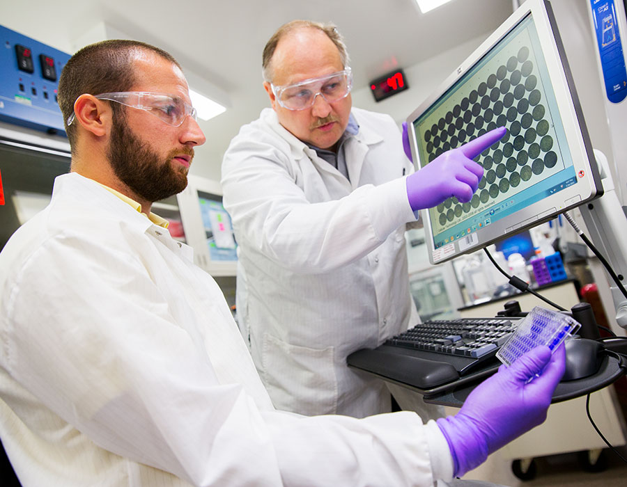 Two lab technicians viewing results on a computer