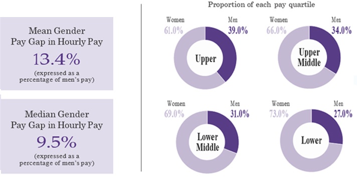 The report shows the difference in average pay between women and men, looking at all levels across the company in the U.K. It also examines the distribution of males and females throughout the organisation in terms of pay levels.